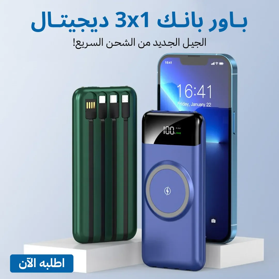 🔋 باور بانك 3×1 لاسلكي – الجيل الجديد من الشحن السريع! ⚡